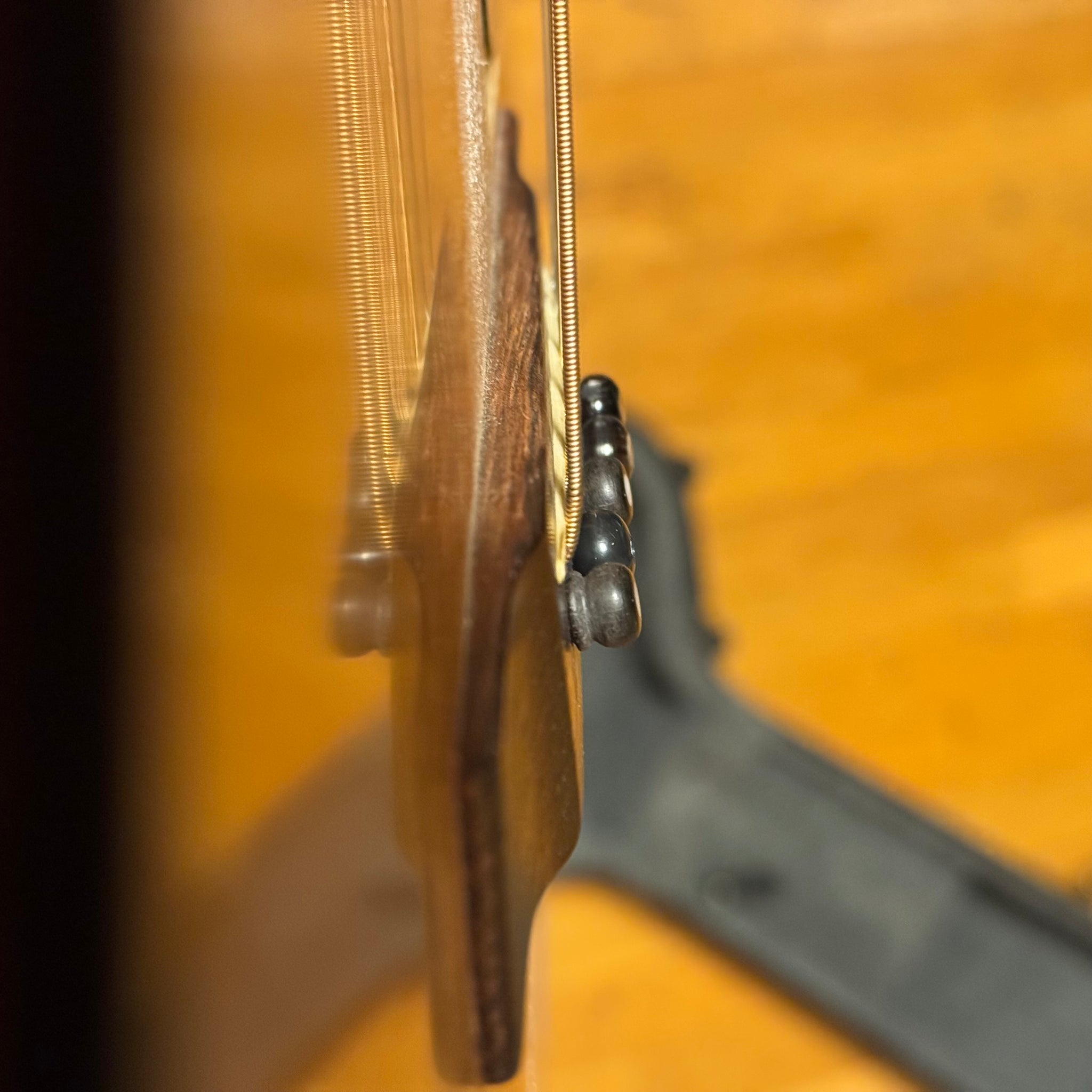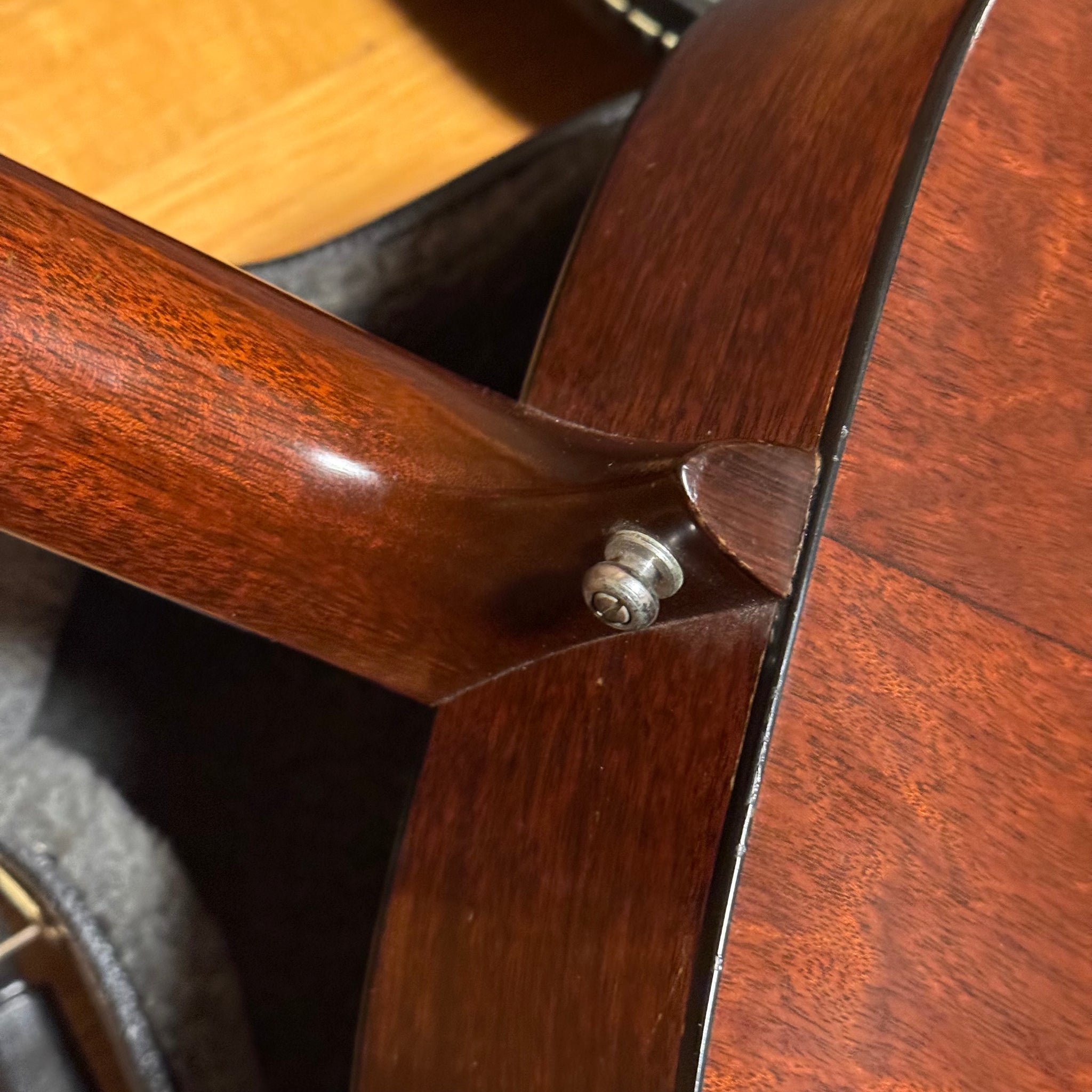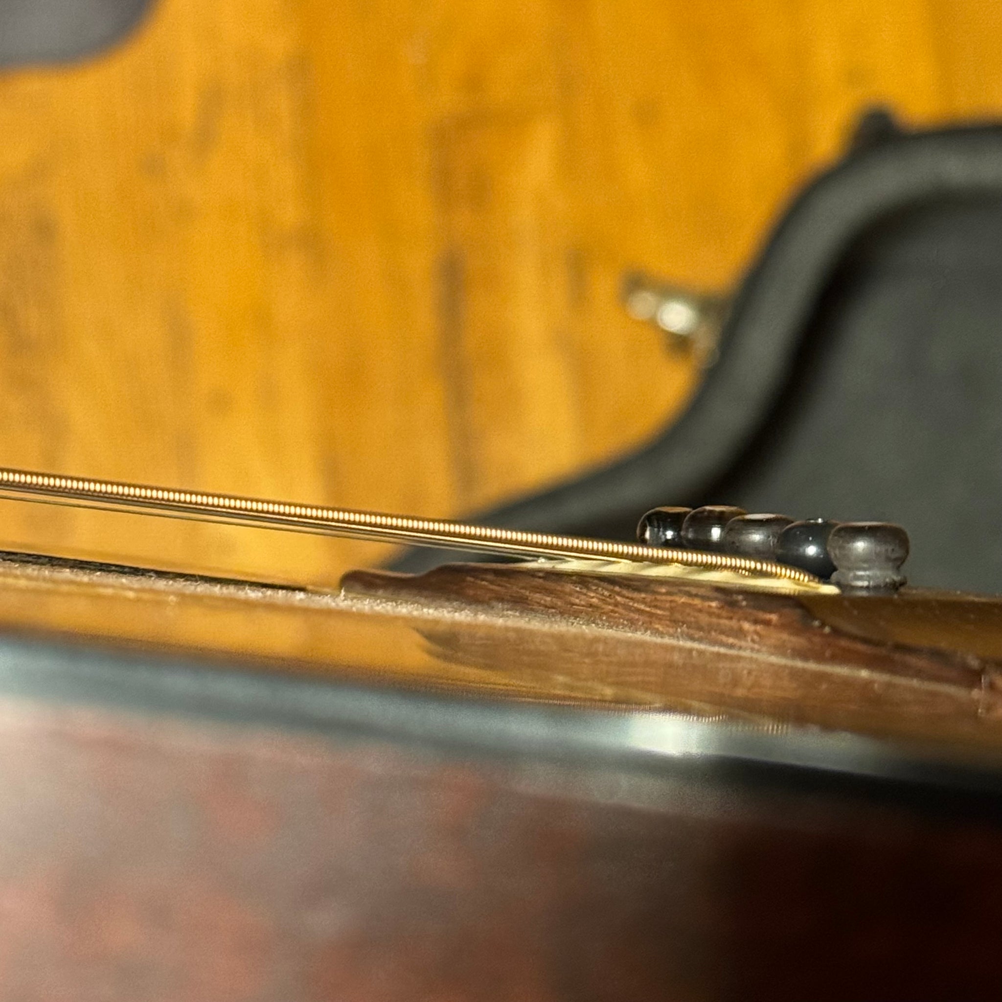 The guitar has not had a neck reset, but it is eminently playable in the current setup. There is a slight amount of lift to the bottom end of the bridge, but it does not seem to be affecting the tone or sustain of the guitar, which is very nice.