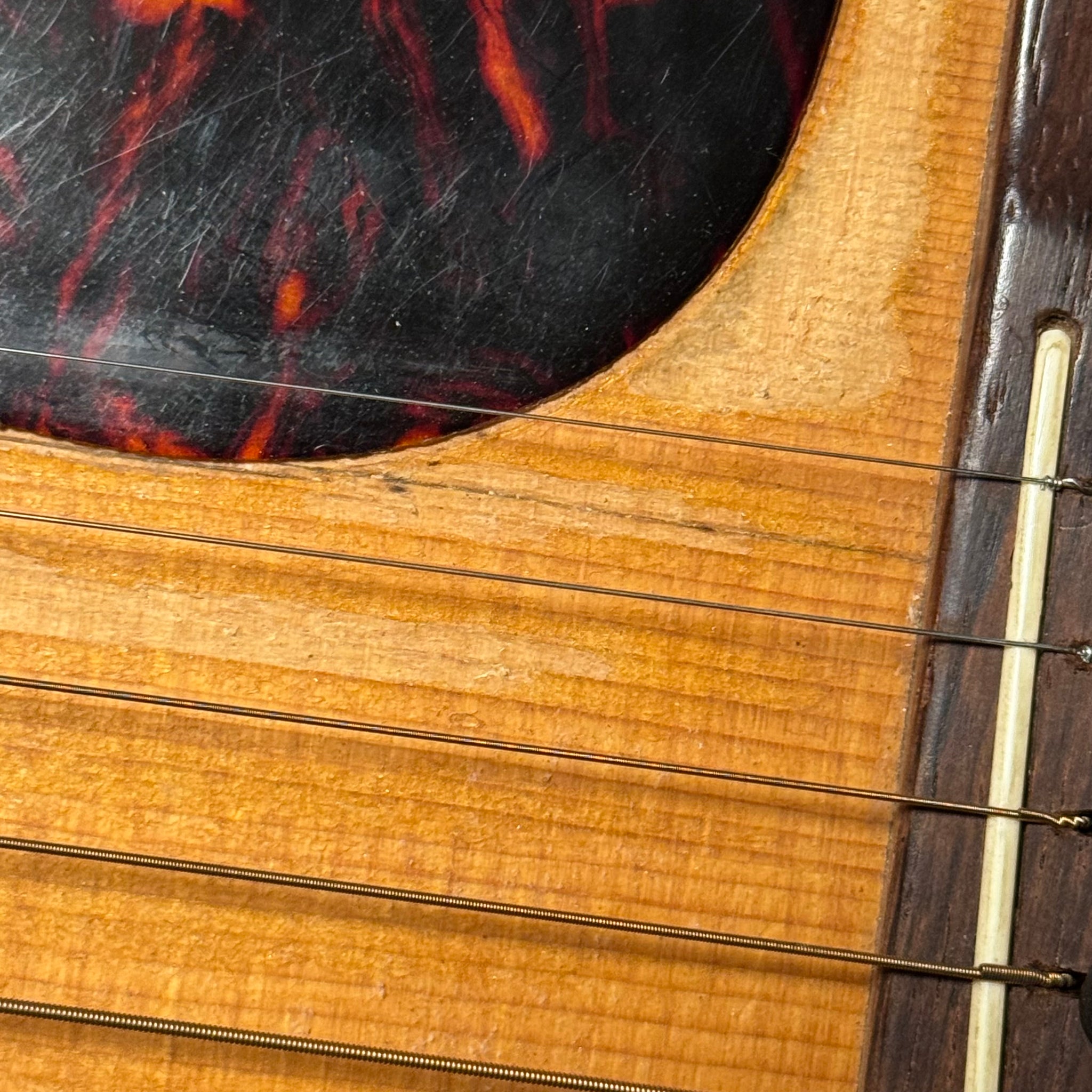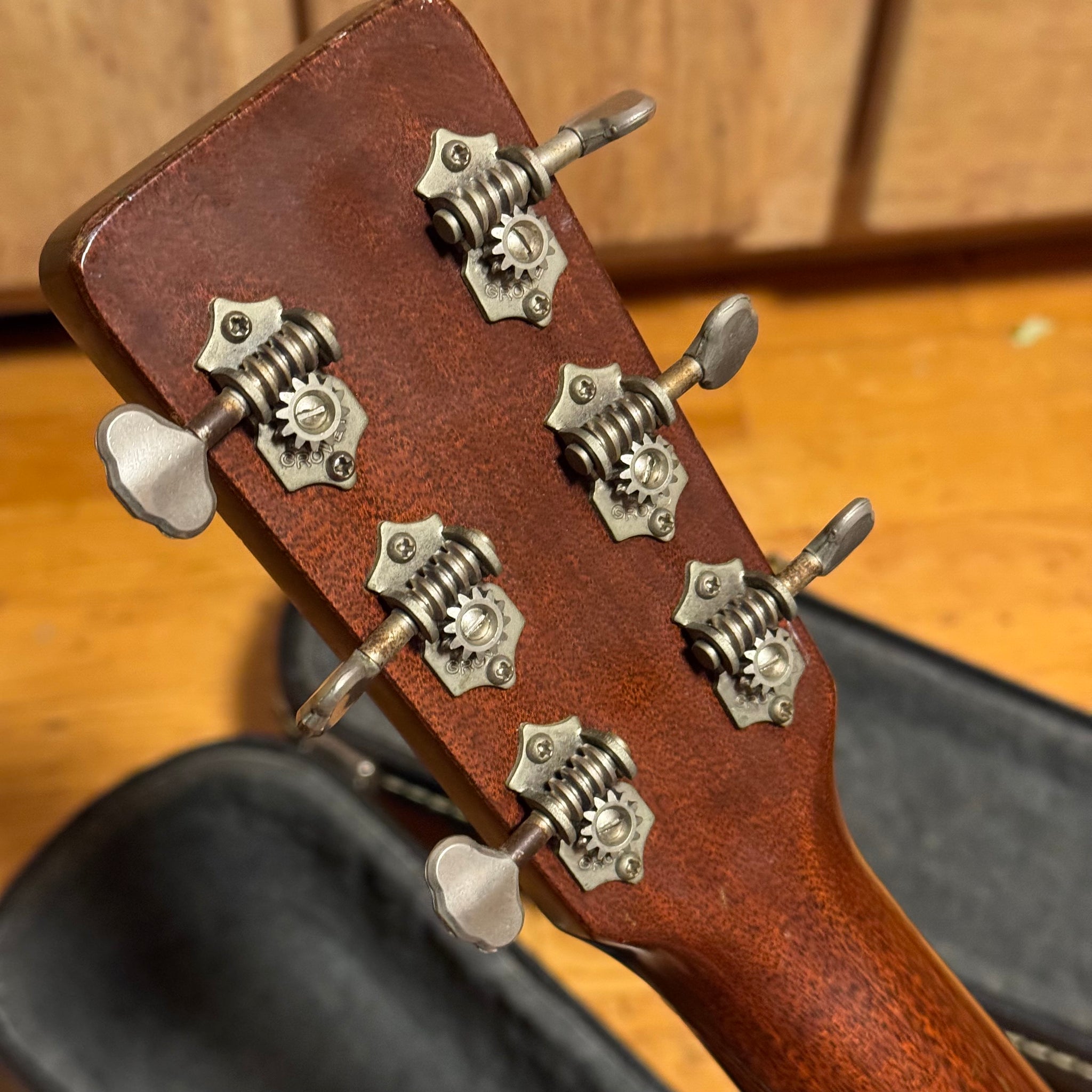 It has the original finish with some wear spots on the top, in the places you would expect from an instrument that has been regularly played. The guitar has been previously serviced. This included a B-string crack repair, the lowering of the saddle to allow for the lowest possible action, a crack on the back, and most significantly a peghead crack repair. There is also a very minor center seam separation that has been addressed with a cleat. Please see the photos for details.