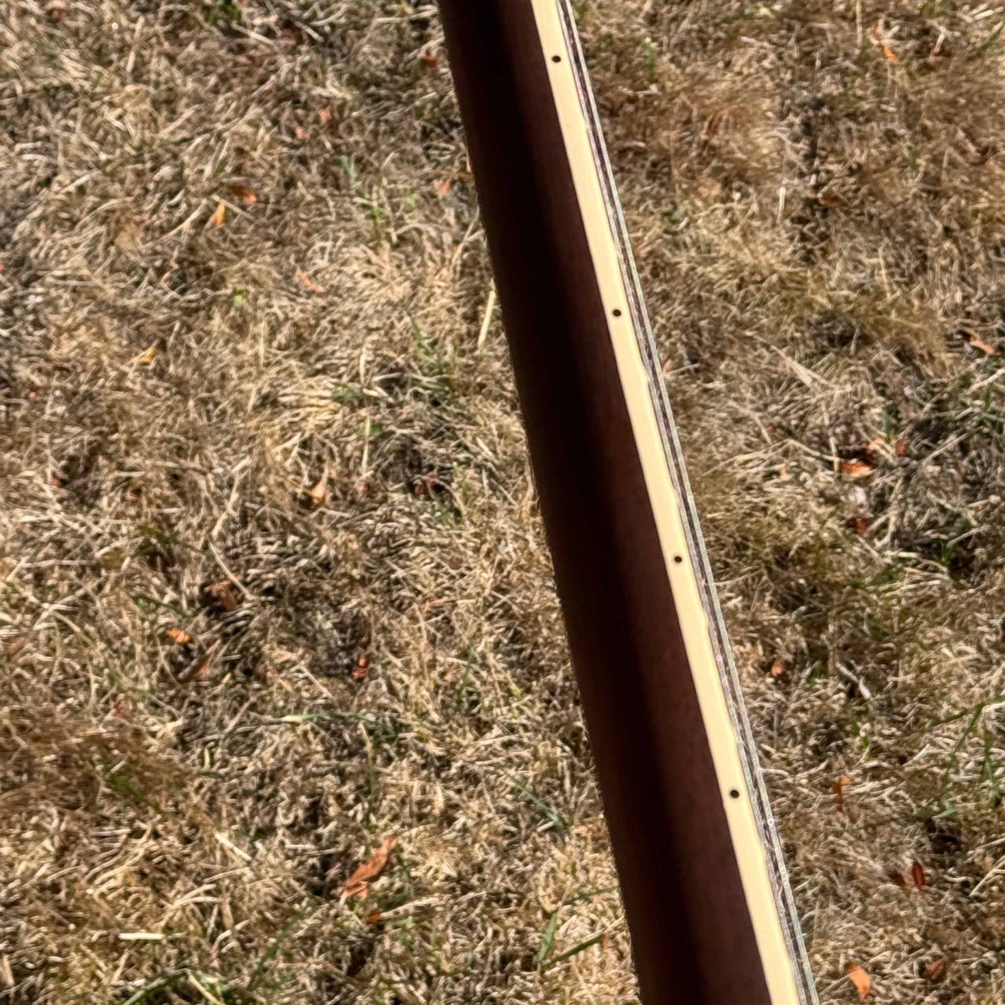 It has the classic 1969 three-piece neck paired with a one-piece body. The headstock shows the characteristic 1969 logo with the broken “O” and “B,” along with no dot over the “i.” The neck profile is a medium-slim carve, closer to a 1960 than a 1959. There are repairs to the headstock and tuner screw areas, but both are solid and stable.