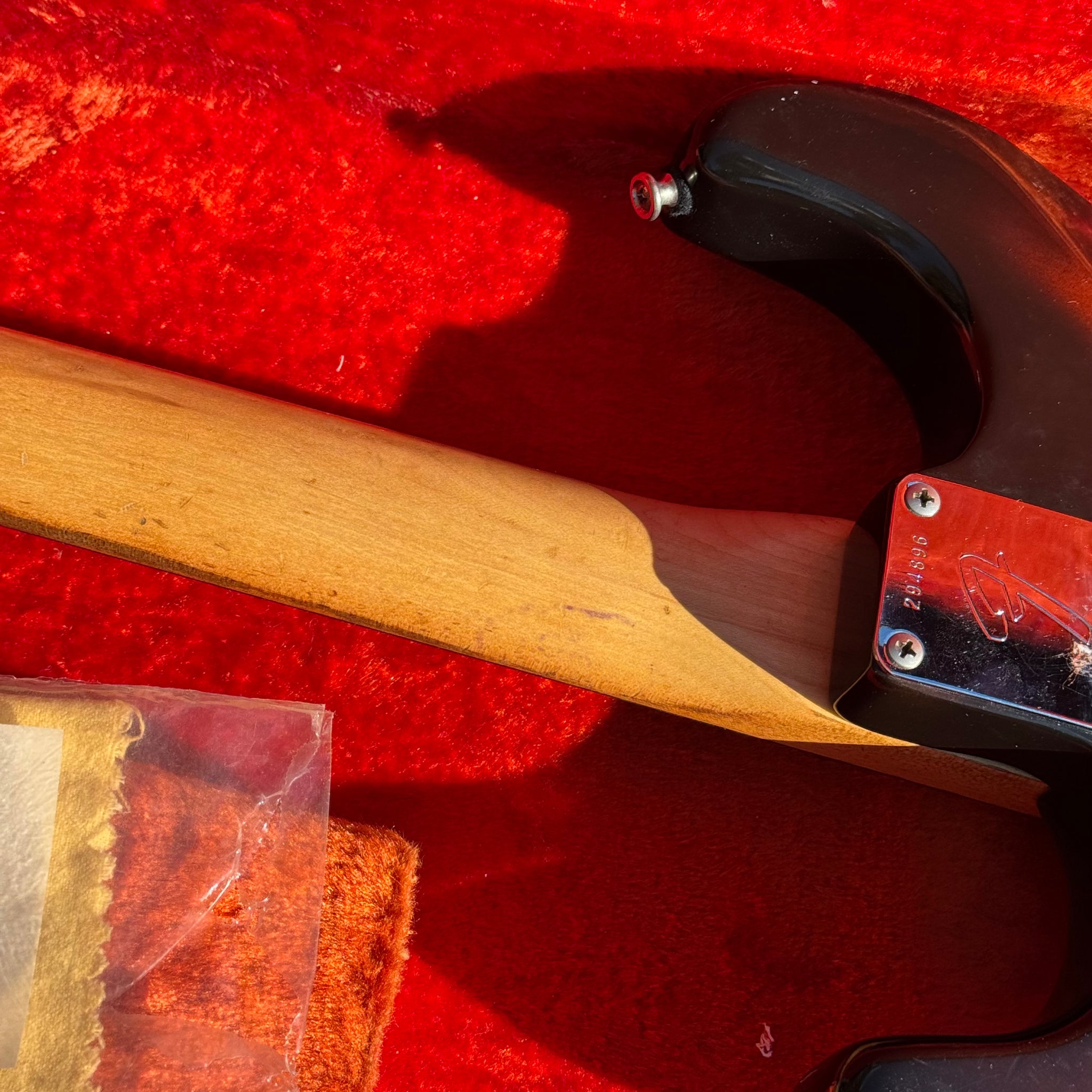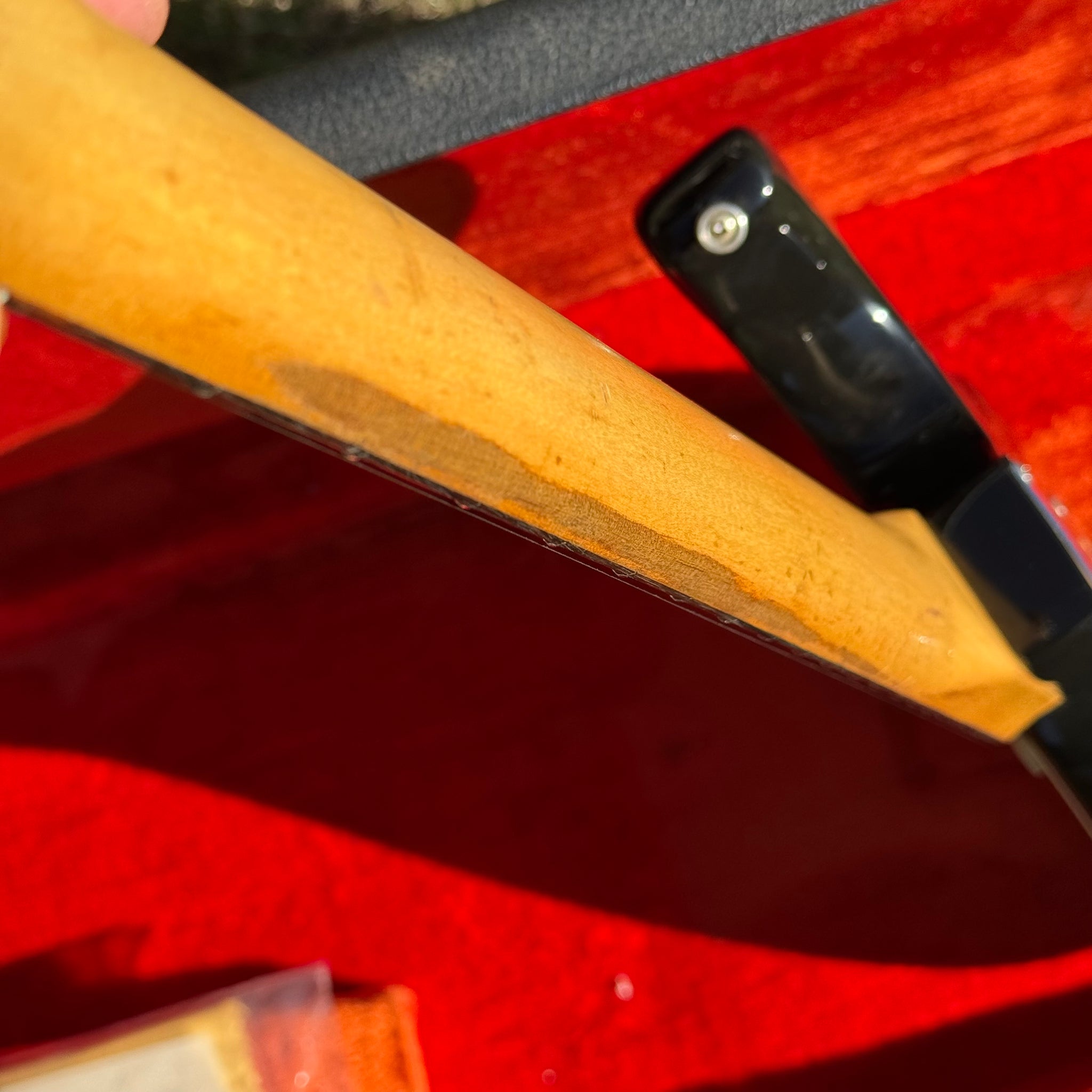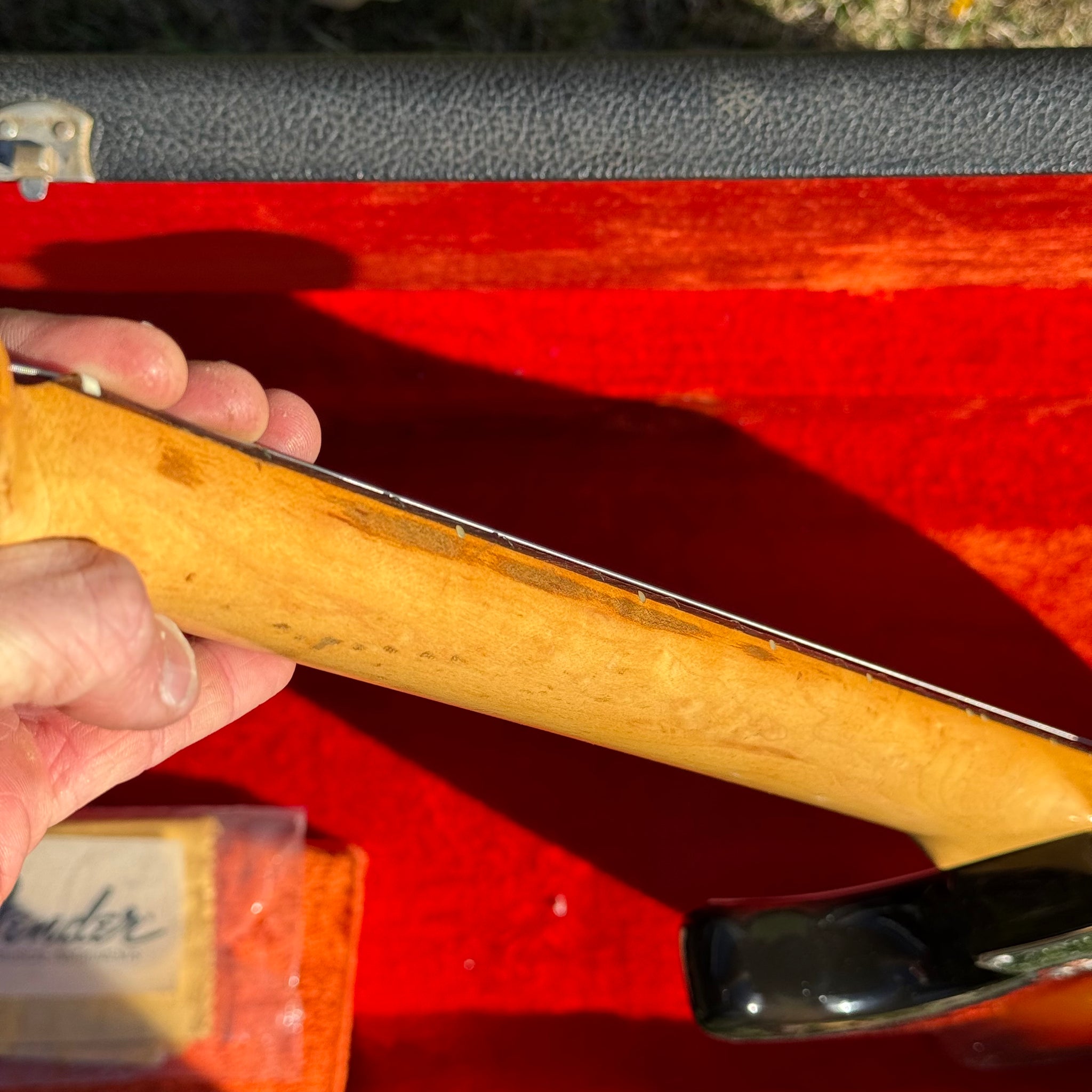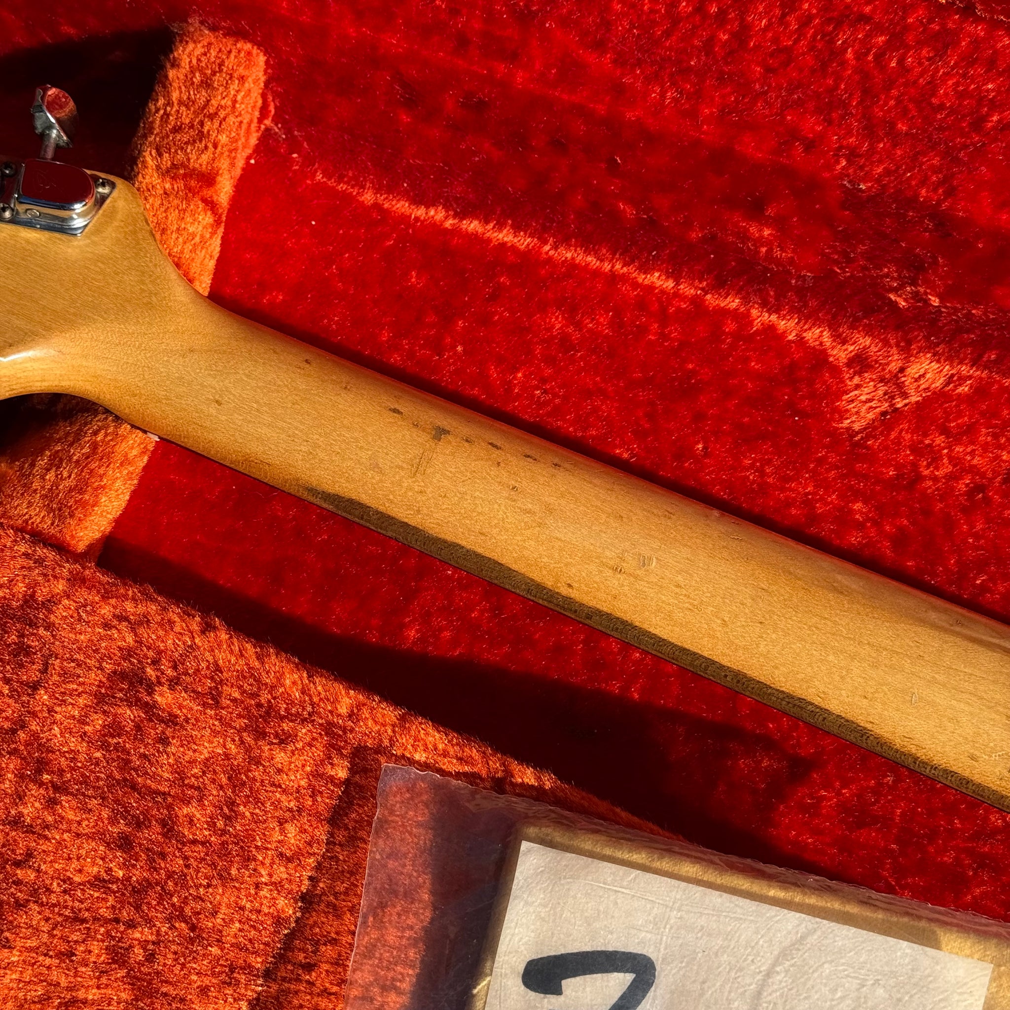This is one of the rare “faux burst” examples with a white undercoat and painted on wood grain simulating a sunburst finish. You can see the white paint in the neck pocket and areas in the routing.