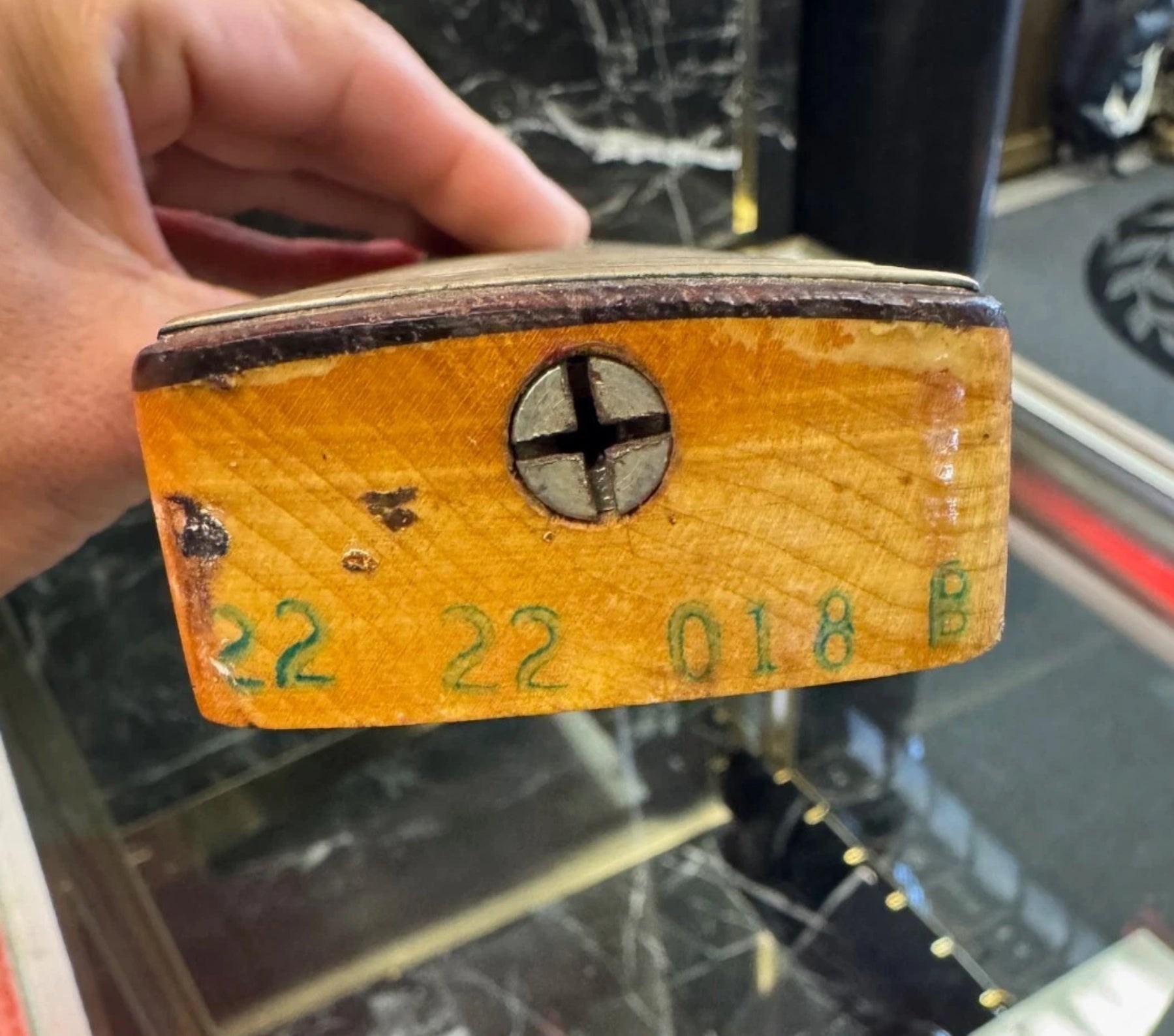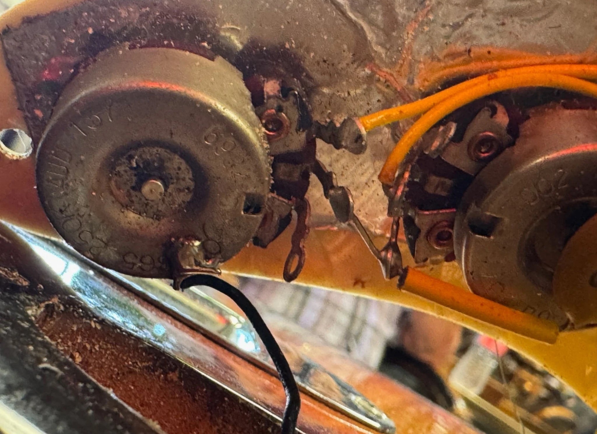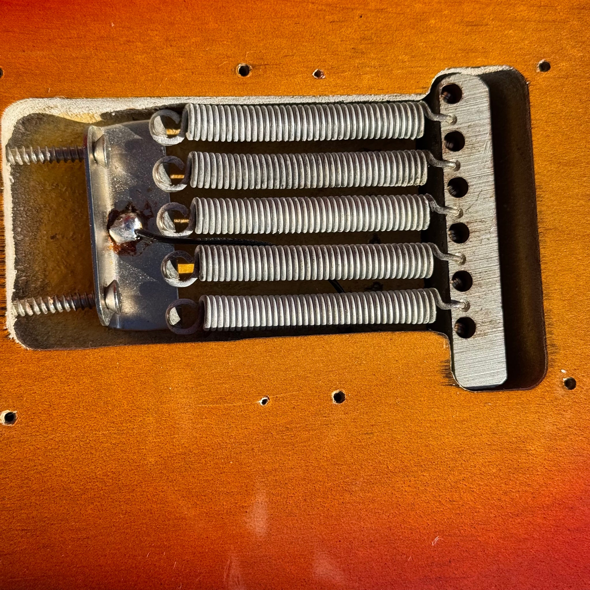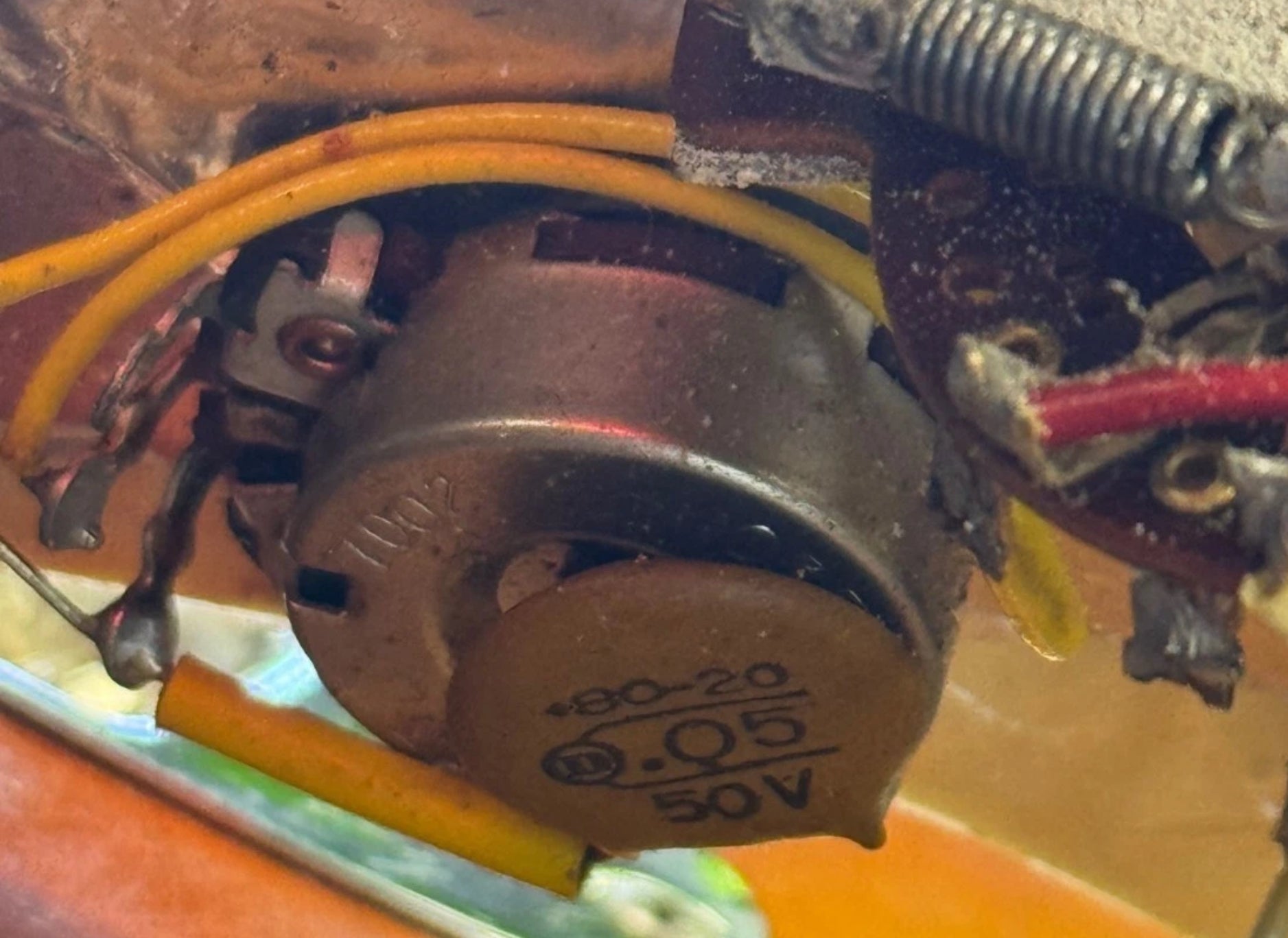This is one of the rare “faux burst” examples with a white undercoat and painted on wood grain simulating a sunburst finish. You can see the white paint in the neck pocket and areas in the routing.