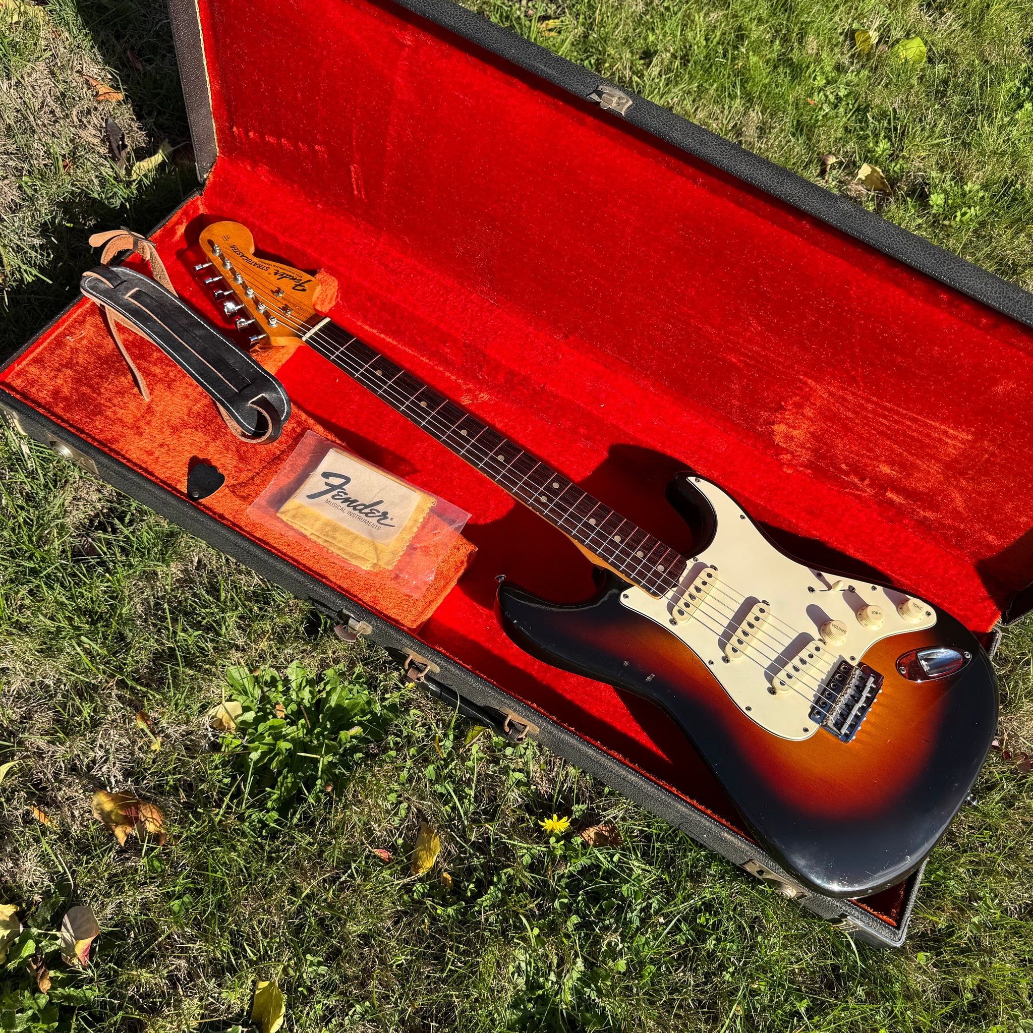 1970 Fender Stratocaster. Original in all the most important places: finish, pots, electronics, essential hardware, etc. Currently has different strap buttons on there—easy to restore. Back plate is included, but is not currently on the guitar. Has an added string tree. Also an extra string here tree hole where at one time they decided to move it.